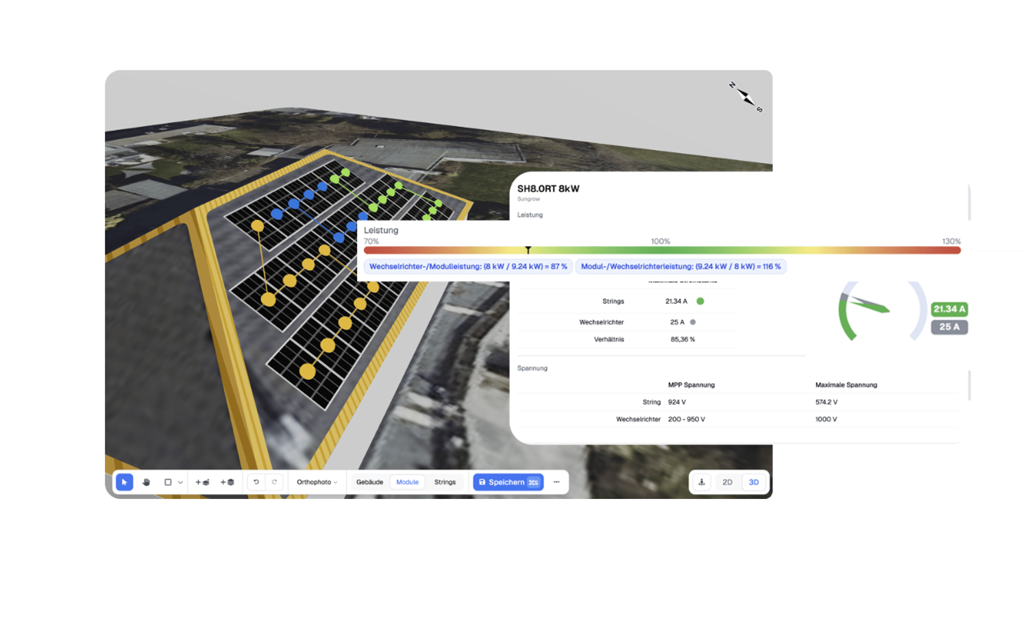 Creare rapidamente progetti precisi del tetto utilizzando immagini satellitari, ortofoto o foto da drone. Identifica ostacoli come camini o lucernari e calcola automaticamente le aree utilizzabili, ottenendo una base accurata per posizionare i moduli in modo efficiente sin dalle prime fasi di progettazione.